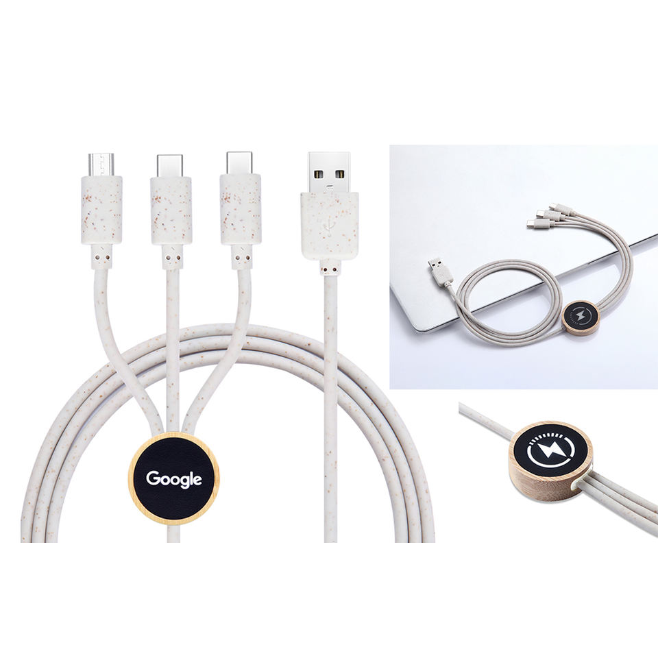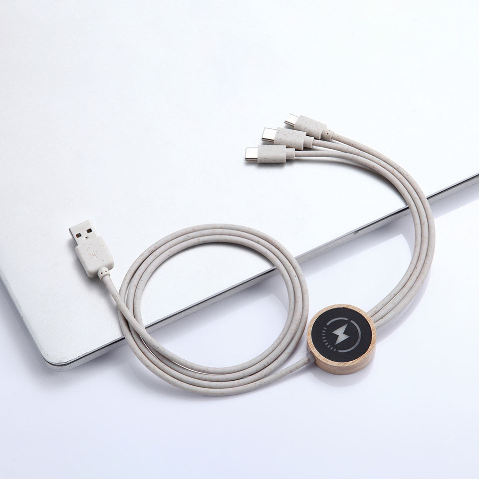 Personalizado LED Light up logo 120CM Trigo Paja 3-en-1 Cable de carga de bambú 3 en 1 Cable de cargador de teléfono luminoso para regalo promocional