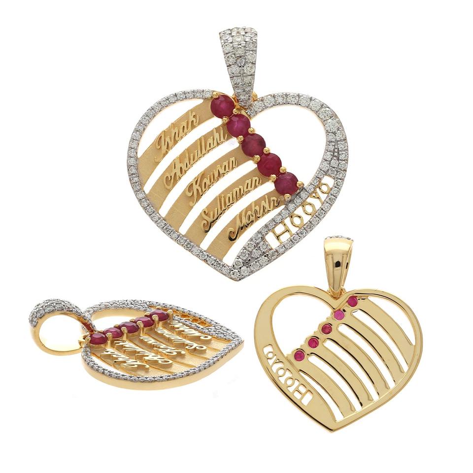Colgante de Oro Amarillo de 14k con Nombre de Familia en Forma de Corazón Personalizado, Rubí Cultivado en Laboratorio, Clásico, Unisex, Regalo de Compromiso, Certificado GIA