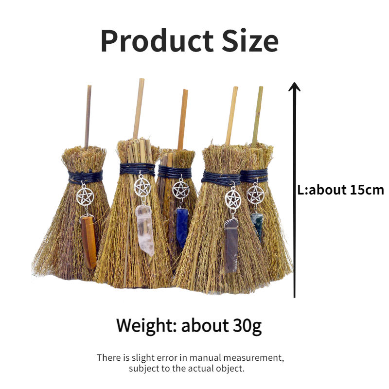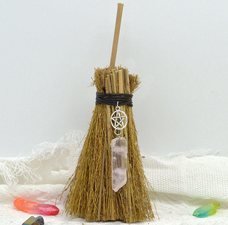 Mini Escoba de Paja de 15 cm con Colgante de Cristal, Decoraciones para Halloween, Escoba de Wicca para Altar, Accesorios de Brujería