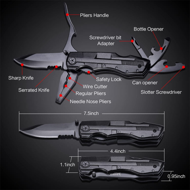 Función:Cuchillo, alicates, hoja de sierra, destornilladores, abrelatas, abrebotellas