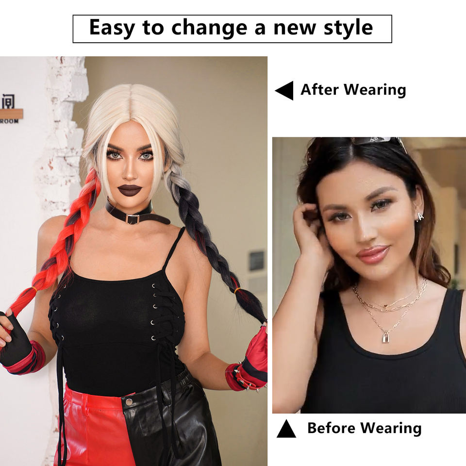 Trenzado rojo y negro disfraz Pigtail trenzas Cosplay peluca Halloween Drag Queen para Suicide Squad Harley Quinn Peluca de pelo sintético