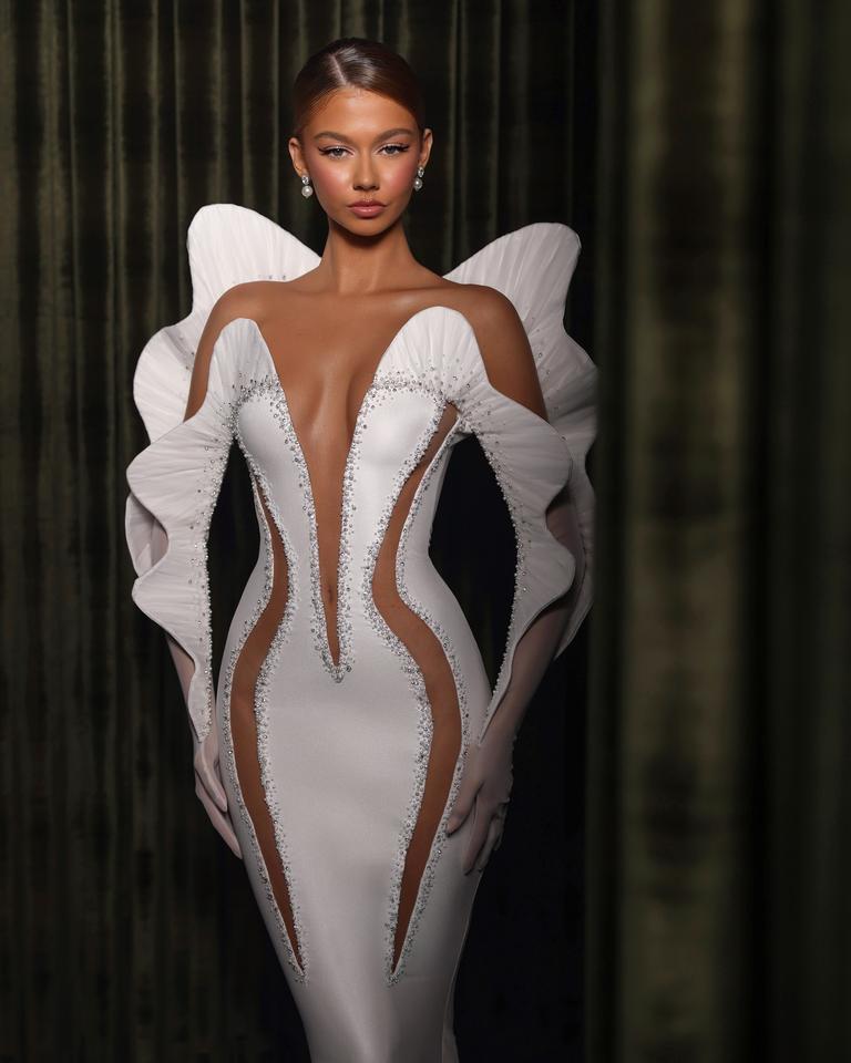 Elegante vestido de fiesta de satén de una línea con delicados Apliques de encaje y mangas transparentes estilo de fiesta con decoración de patrón