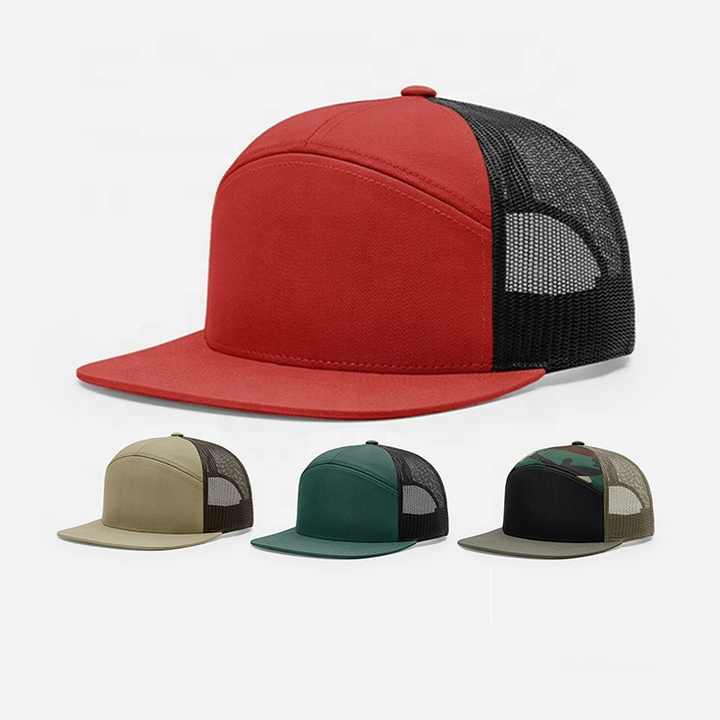 Logotipo personalizado 7 Panel Flat Brim Trucker Sombreros Snapback Mesh Trucker Caps