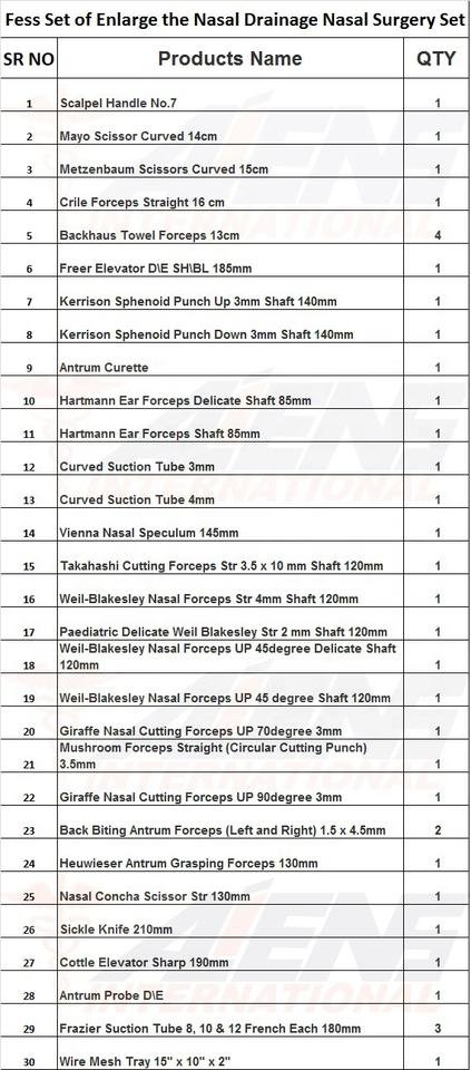 Nombre del producto:Instrumentos ENT Set de cirugía endoscópica de los senos