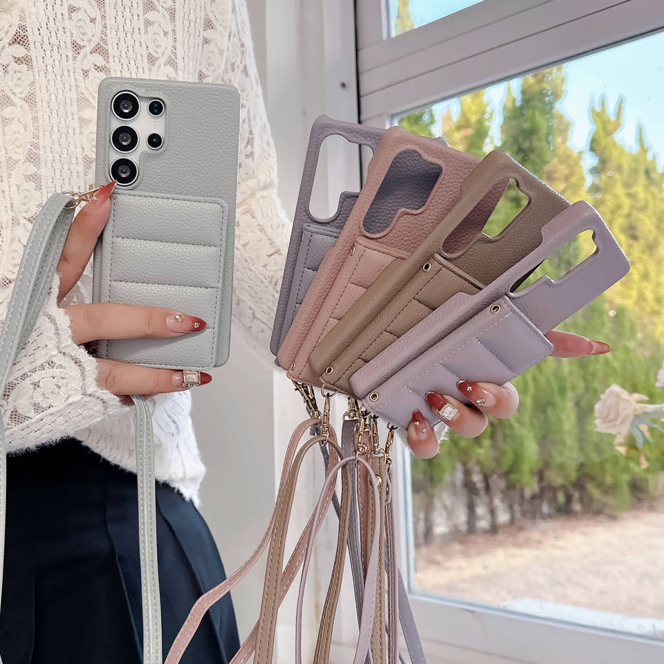 Litchi PU cuero The Puffer Wallet funda para Samsung Galaxy A13 A22 A33 A53 A54 A14 A24 5G tarjeta dinero ranuras colgante cuerda cubierta