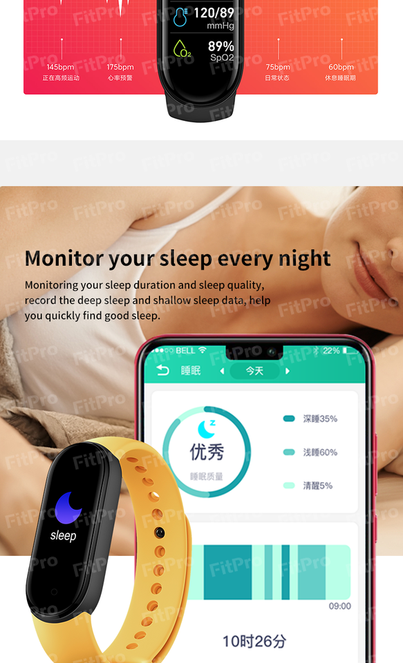 Funciones:Frecuencia cardíaca, presión arterial, oxígeno en la sangre, música