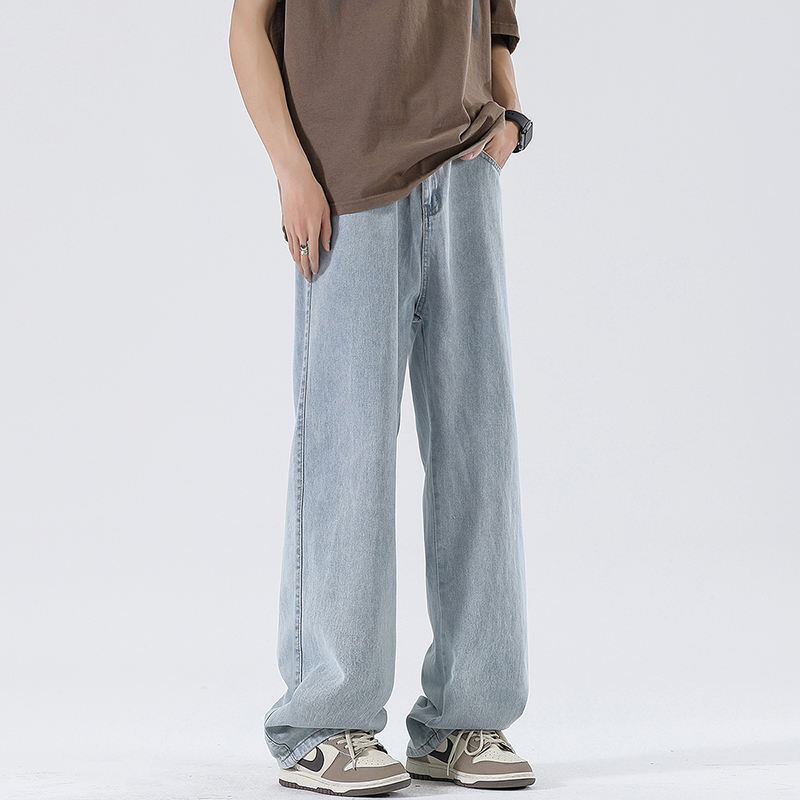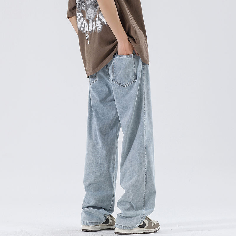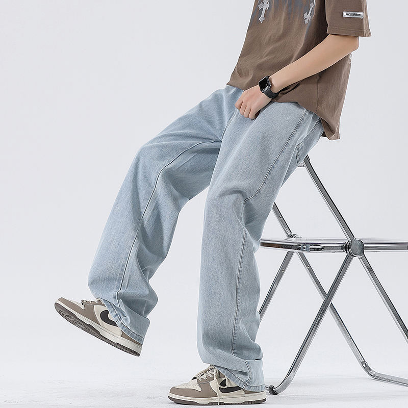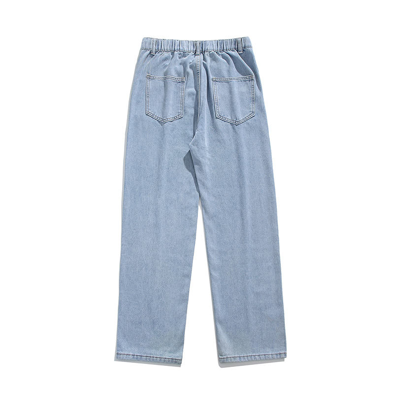 Pantalones vaqueros de pierna recta relajados de cintura alta azul claro para hombre, cintura ajustable, 5 bolsillos, diseño Vintage, acentos para estilo informal