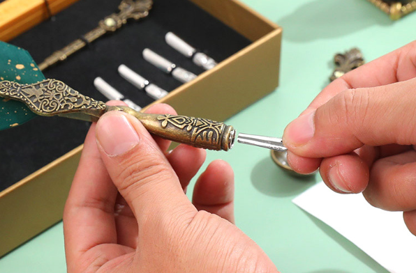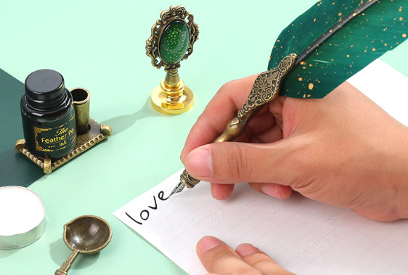 Nuestro bolígrafo luce delicado con plumas seleccionadas y vaporizadas.