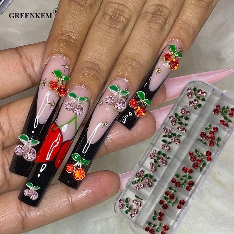 Colgante de aleación con forma de corazón para uñas, 3D diamantes de imitación, diseño de cereza, adornos acrílicos de lujo para decoración de uñas
