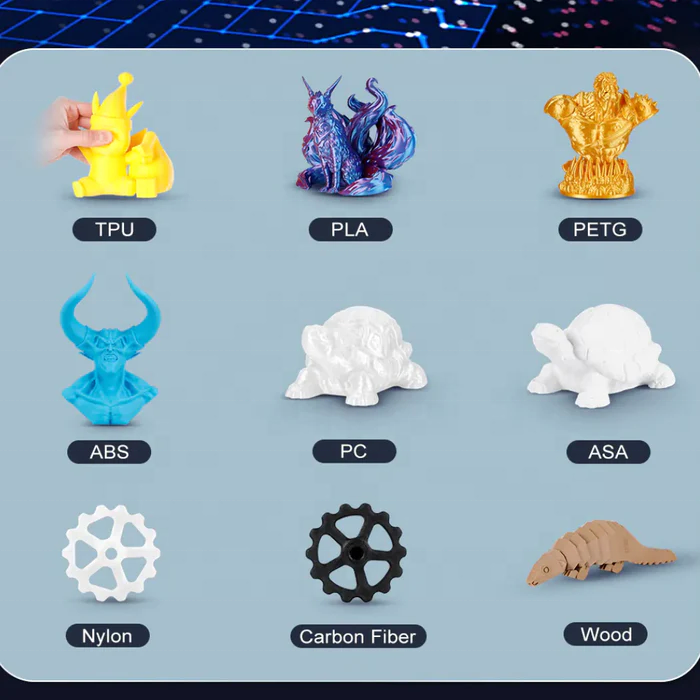 Material de impresión:PLA, ABS, TPU, PETG, MADERA, PC,ASA, nilón, fibra de carbono