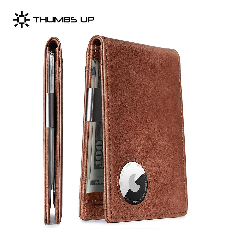 THUMBS-UP Bifold RFID Block Money Clip ID Window Material de cuero genuino Minimalista Air Tag Wallet para regalo