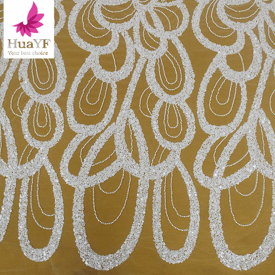 Venta Superior francés blanco con cuentas lentejuelas nupcial vestido de encaje de novia Aso Ebi venta al por mayor para 5 yardas 2017