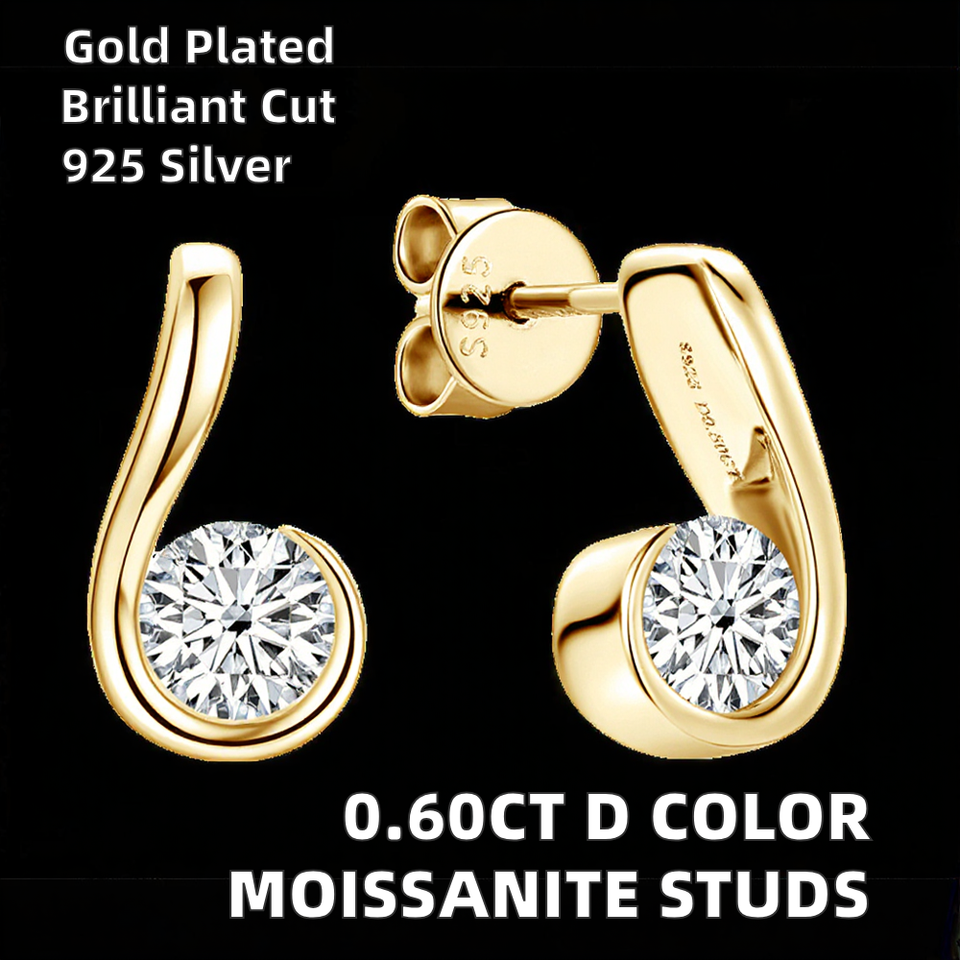 Pendientes de Moissanita de 0.60CT y 3mm con Engaste de Bisel, Color D, Corte Brillante, Chapados en Oro, Plata 925, Diseño Curvo, Modernos, Certificados GRA