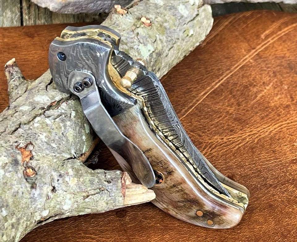Cuchillo de Bolsillo Plegable de Acero de Damasco Hecho a Mano Personalizado, Diseño OEM, Bloqueo Trasero, Hoja Plegable Alemana para Caza, Cuerno de Carnero