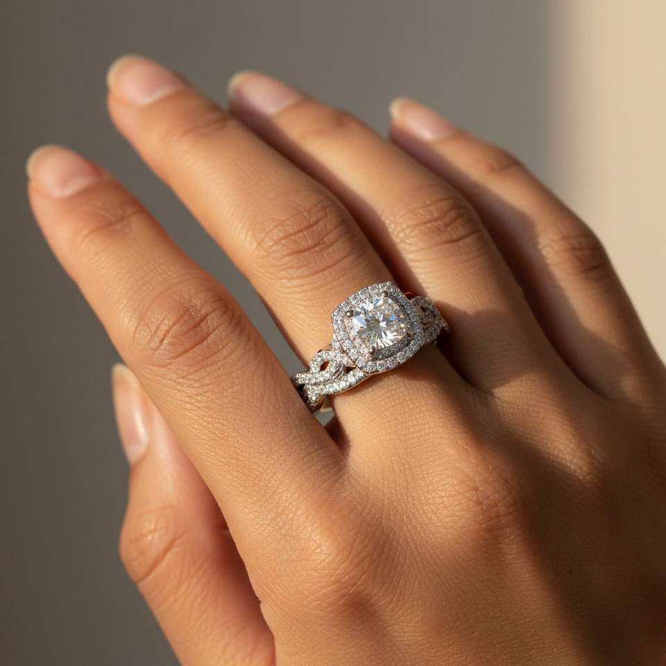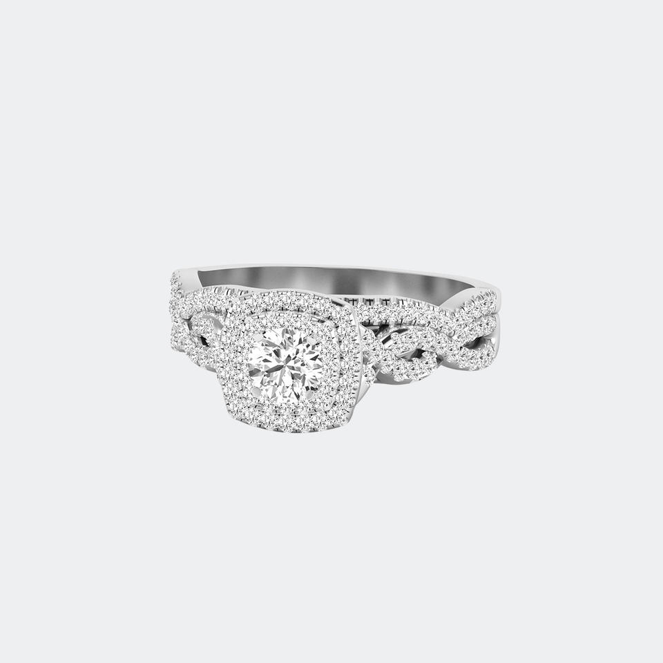 Anillo Solitario Redondo de 1.00CTW Cultivado en Laboratorio con Halo Trenzado y Chapado en Oro, Lujoso para Mujer