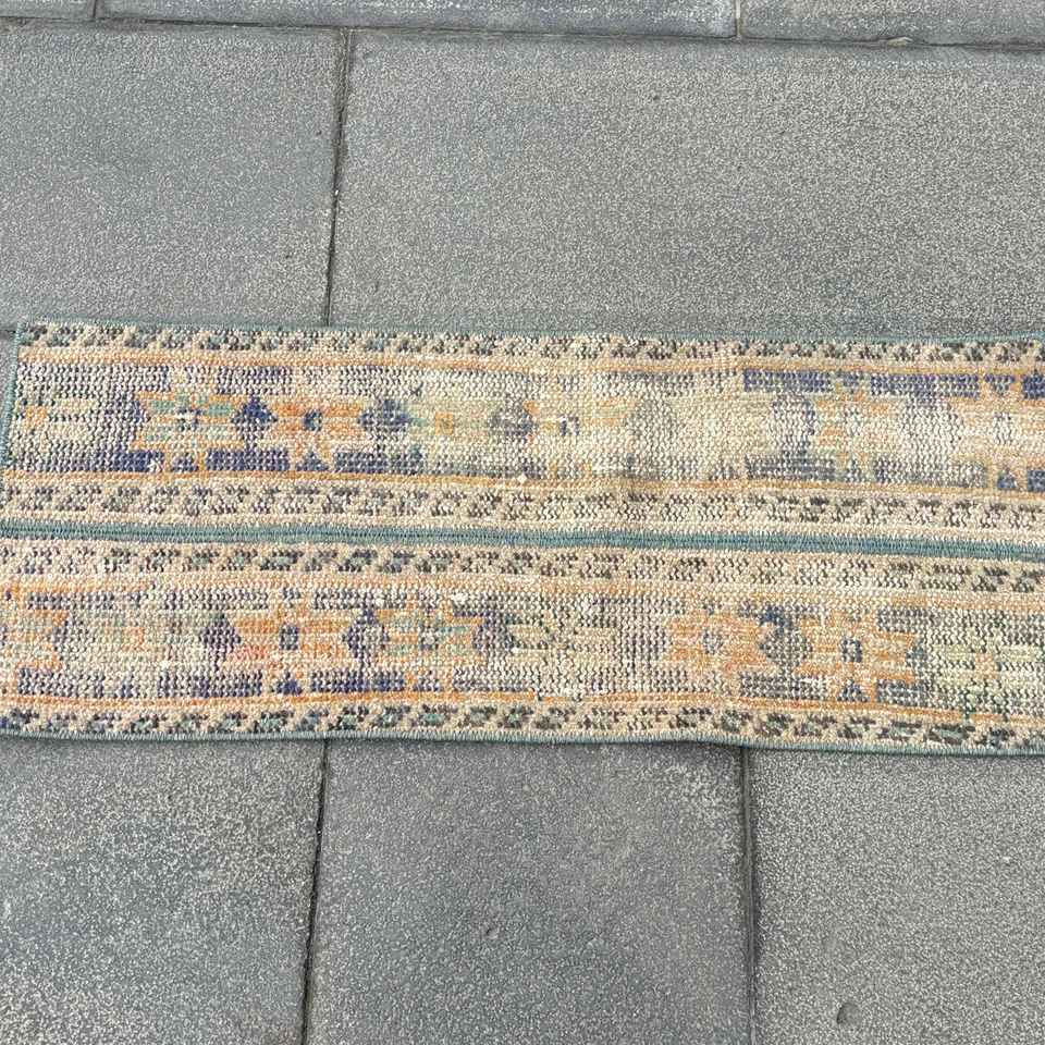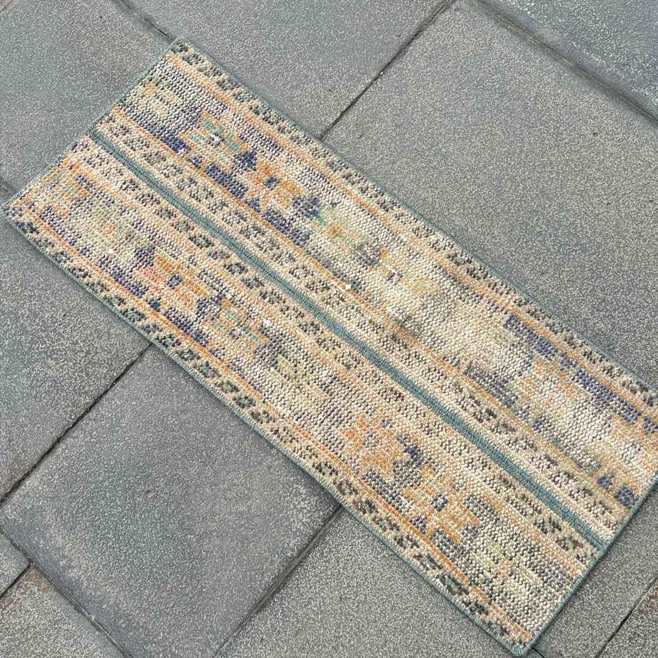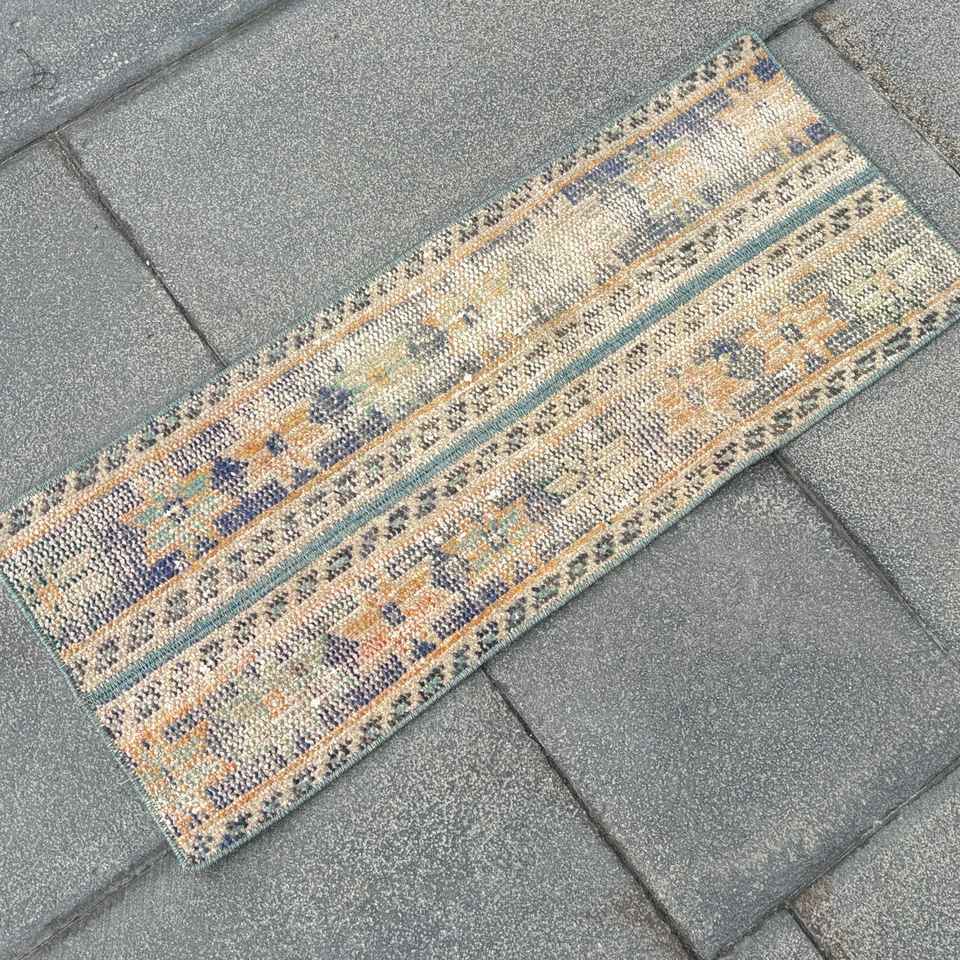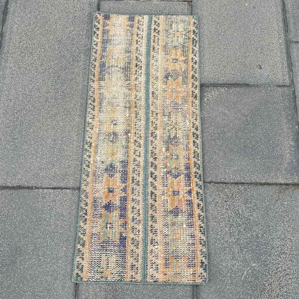 Alfombra Turca Vintage de 1.1x2.7 pies, Alfombra Pequeña Azul de Lana Ikat, Alfombra Ecológica con Respaldo de Látex