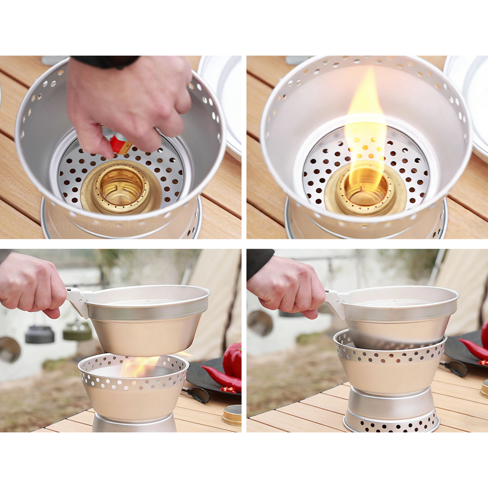 Juego de Cocina para Camping de 8 Piezas de Aluminio Plateado Apilable de 1.2L y 1.5L con Estufa de Alcohol Integrada