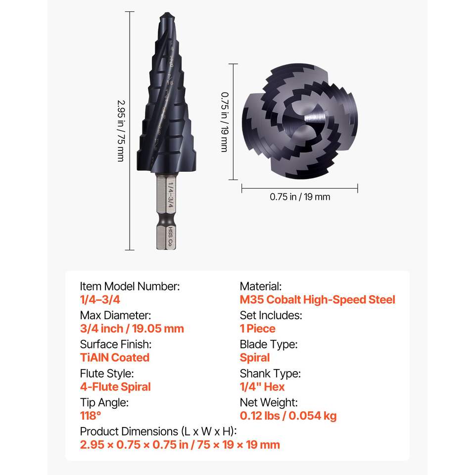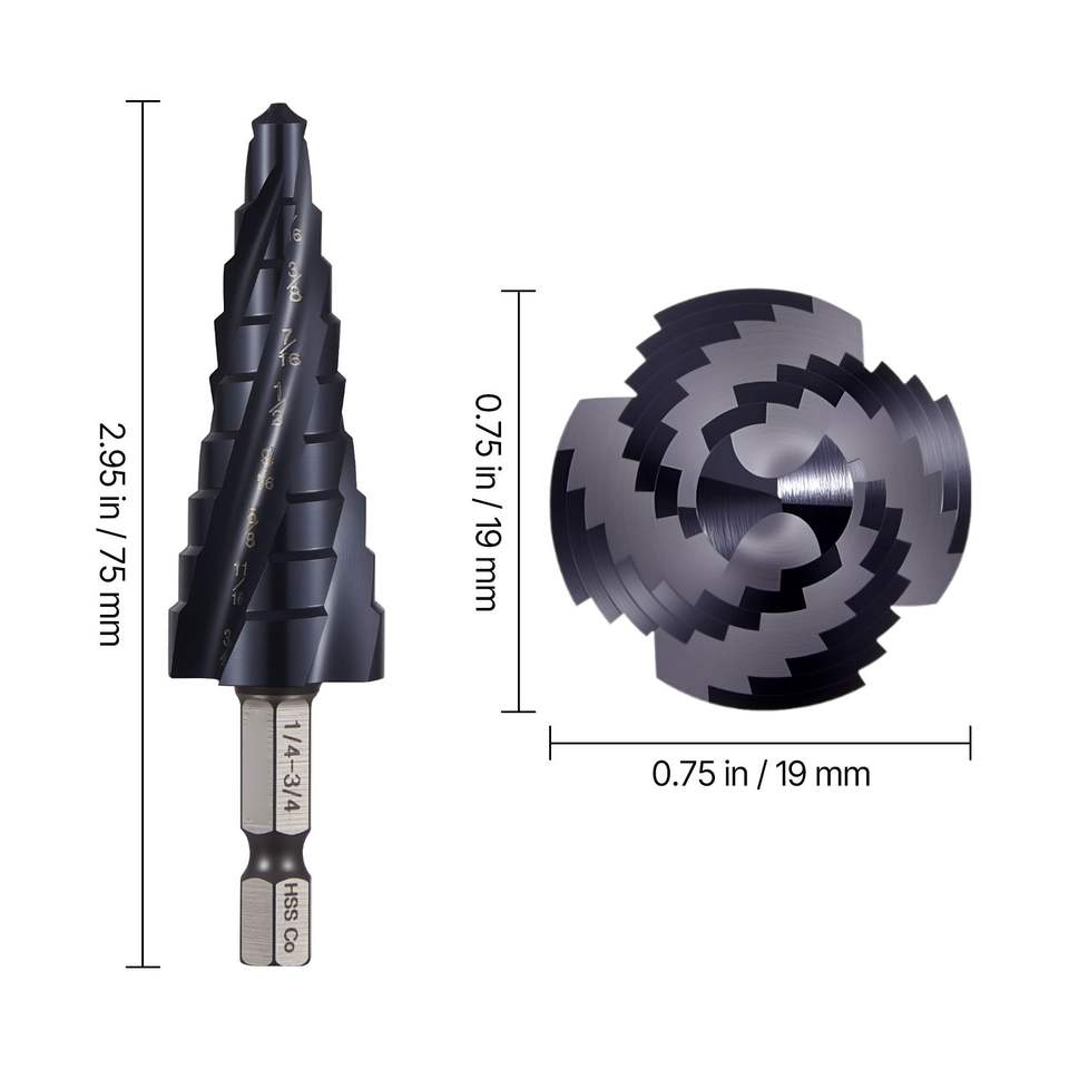 Broca escalonada de acero de alta velocidad HSS con revestimiento de TiAlN de 1/4 y 3/4 pulgadas, cuatro estrías espirales, multiusos, con vástago hexagonal de 1/4 pulgada