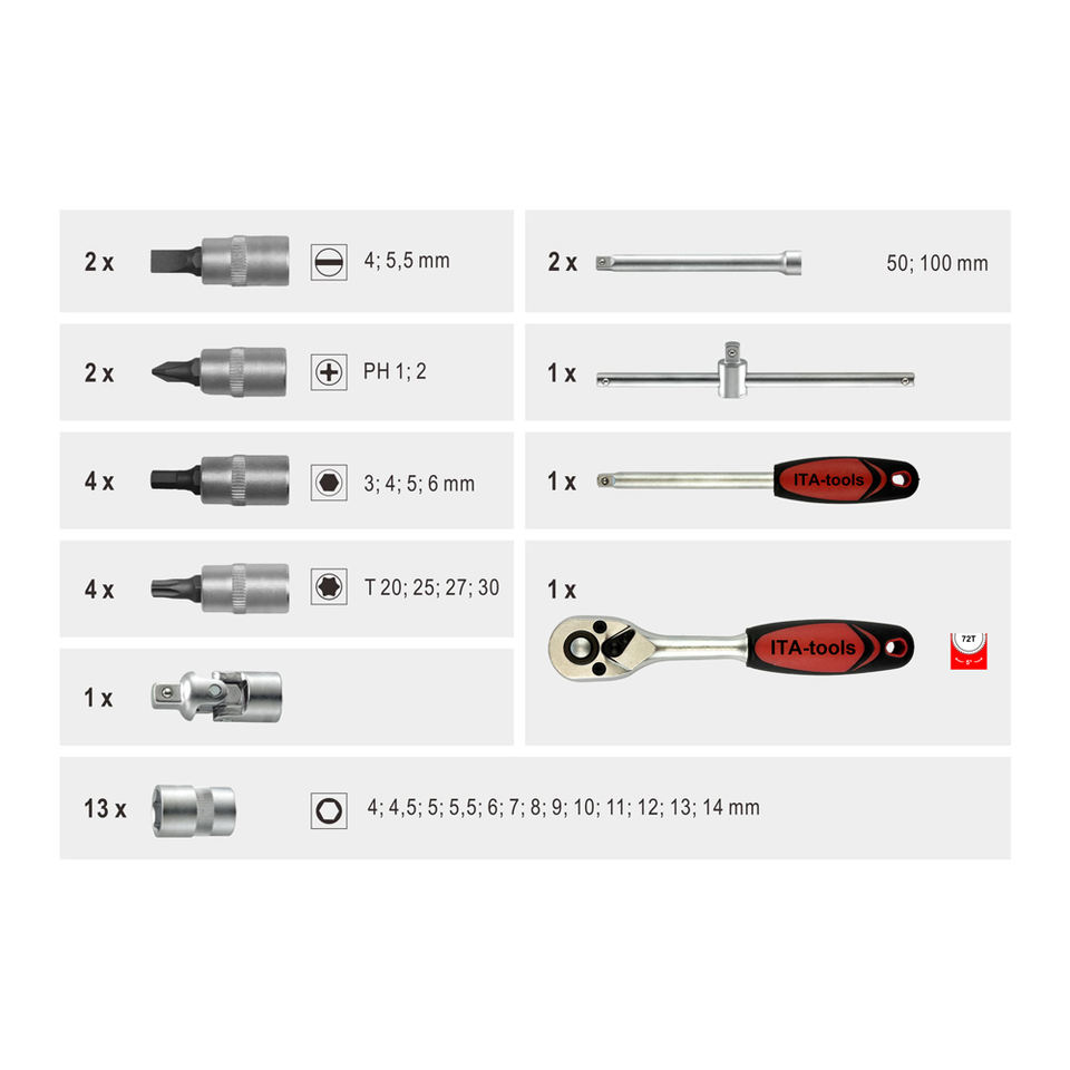 Socket bit, Barra de extensión, Manija del trinquete, Zócalo, Junta universal, Mango en T deslizante, Mango SpinnerHerramienta incluye