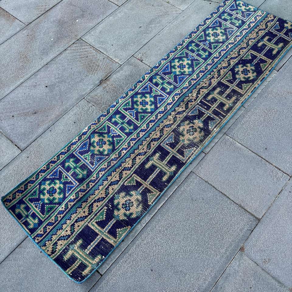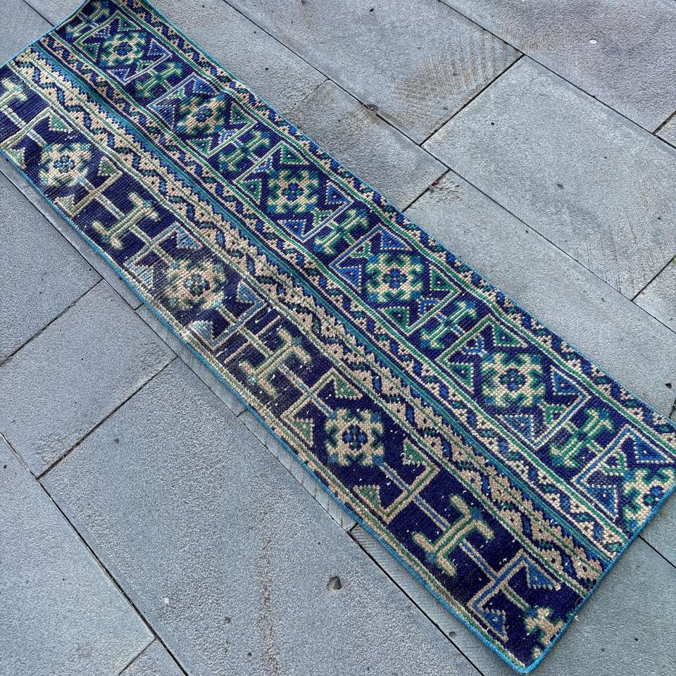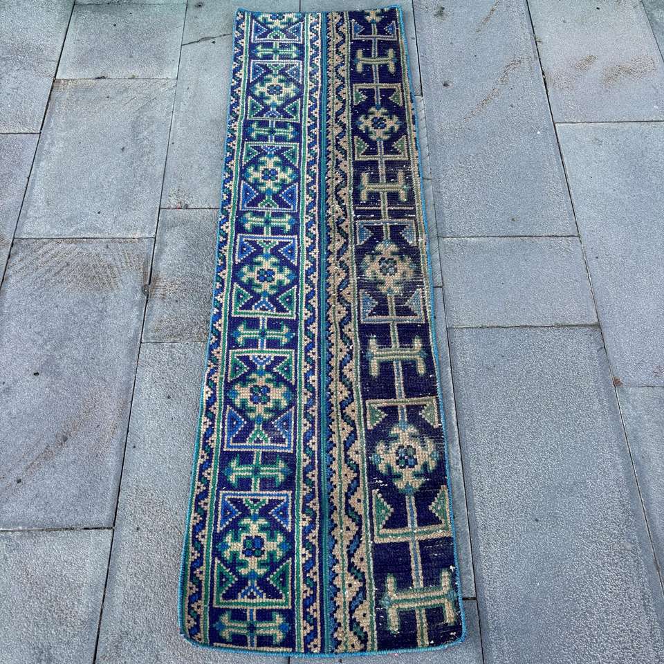 Alfombra Vintage de 1.4x5 pies, Alfombra Turca Pequeña, Alfombra Azul de Lana Marroquí