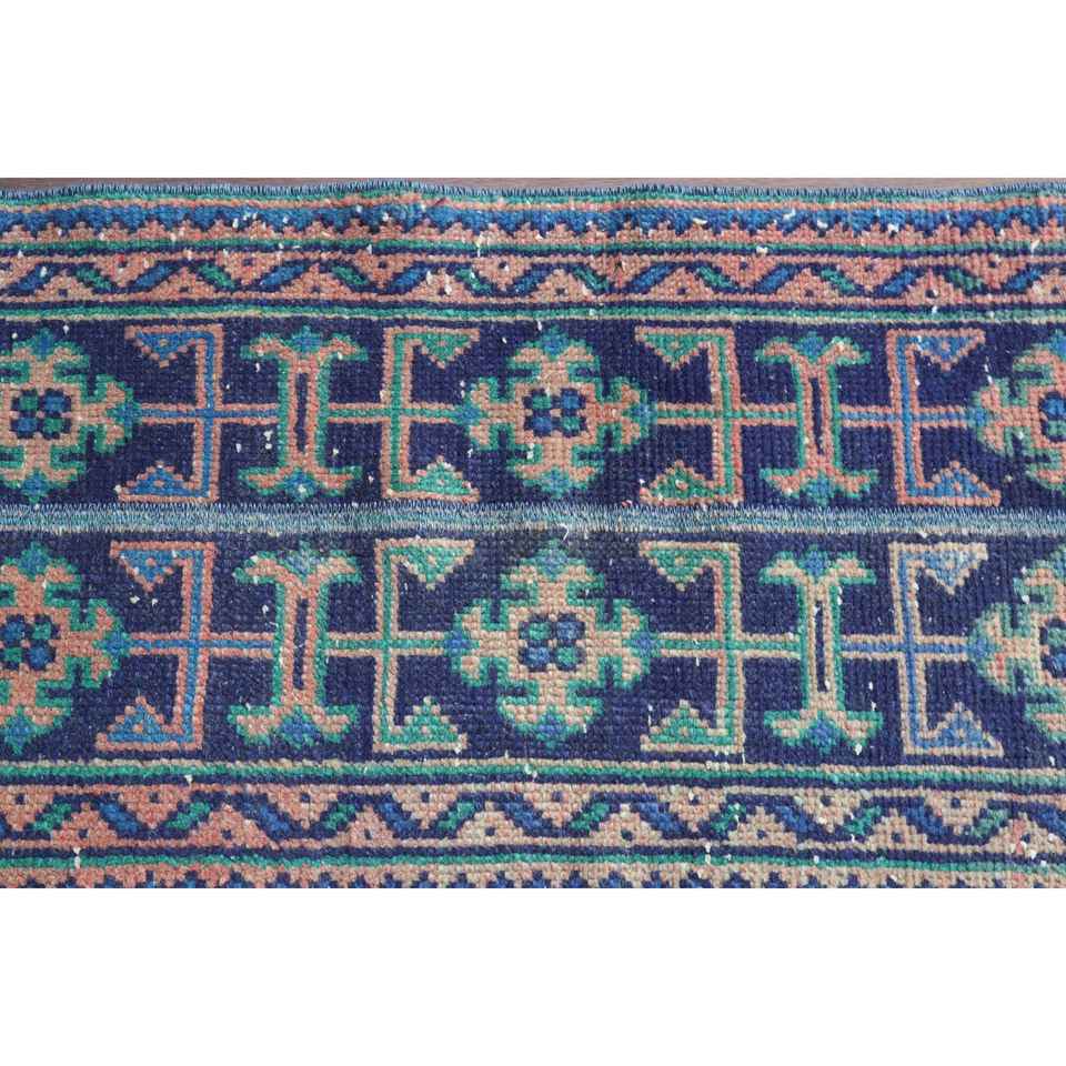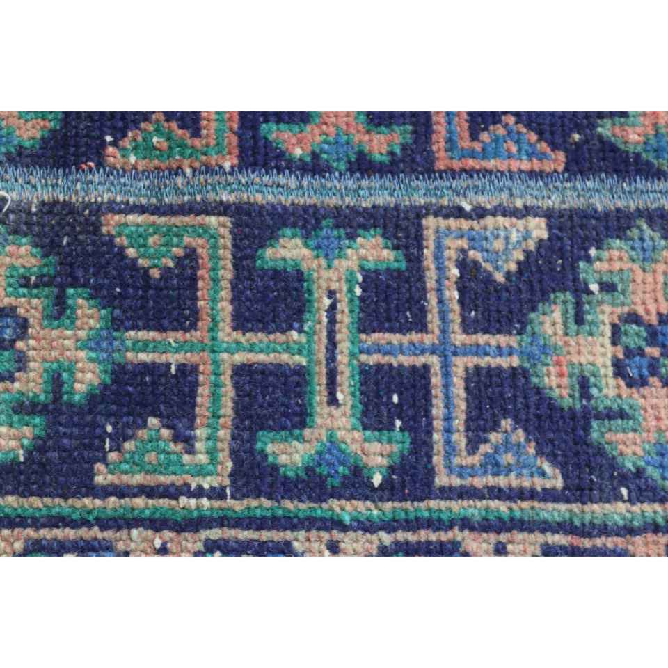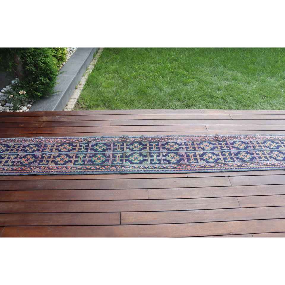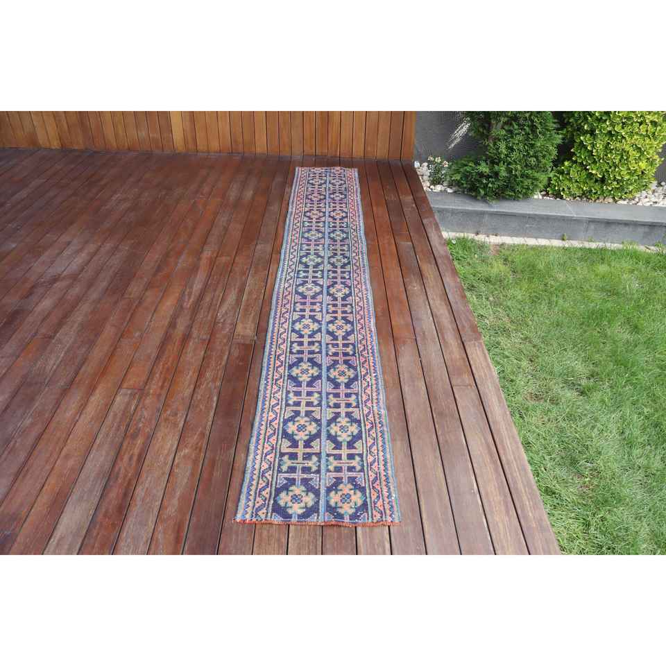 Alfombra Vintage de 1.4x9.8 pies, Alfombra Turca Azul a Cuadros de Lana