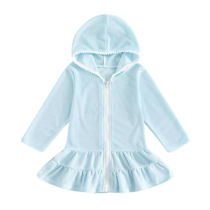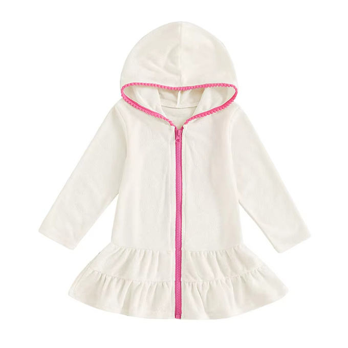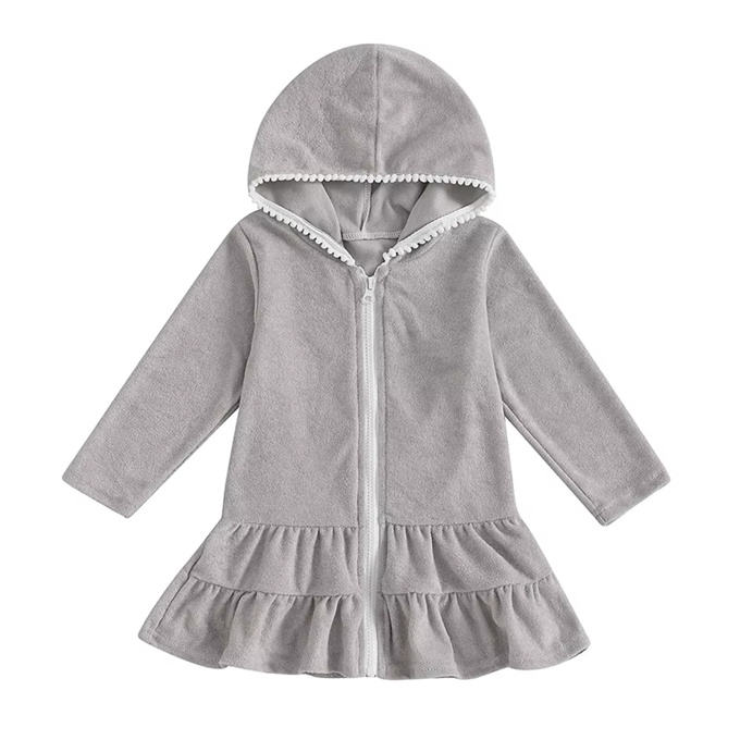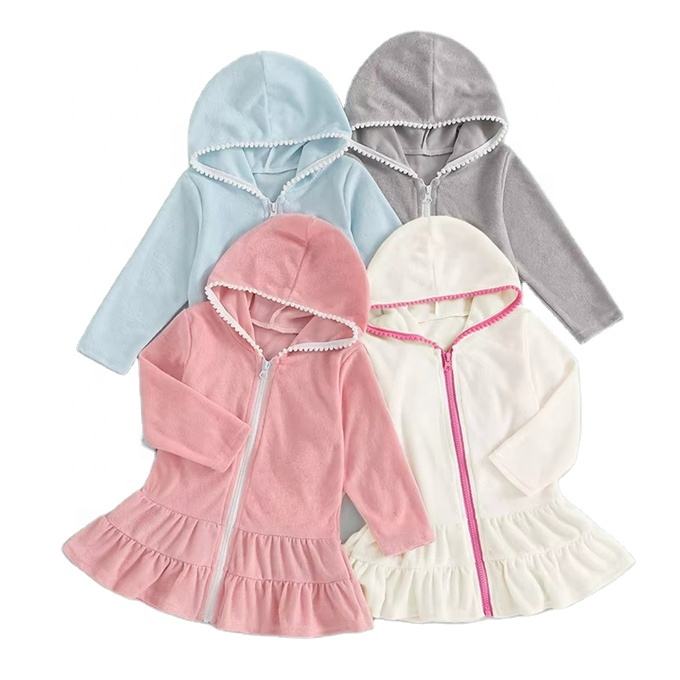 1 Uds. Vestido CON CAPUCHA DE Color sólido con etiqueta privada, bata con cremallera, toalla, bikini para niños, ropa de playa, vestido de baño para niñas