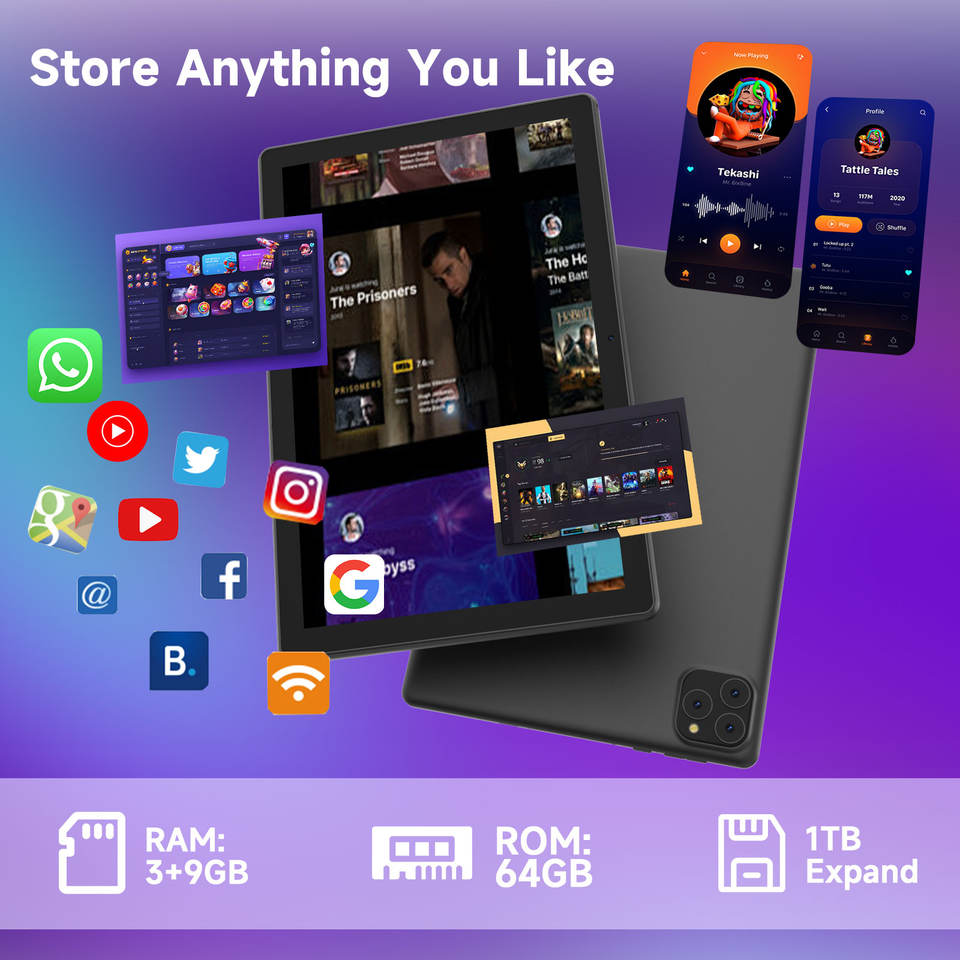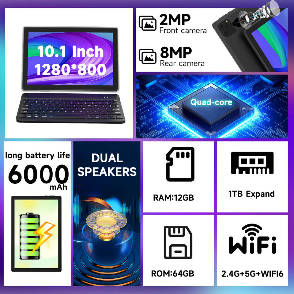 Tablet PC de 10.1 Pulgadas, 12GB (3GB+9GB Expandibles) de RAM, 64GB de ROM, Batería de 6000mAh, WIFI+BT con Teclado, Funda, Ratón y Lápiz