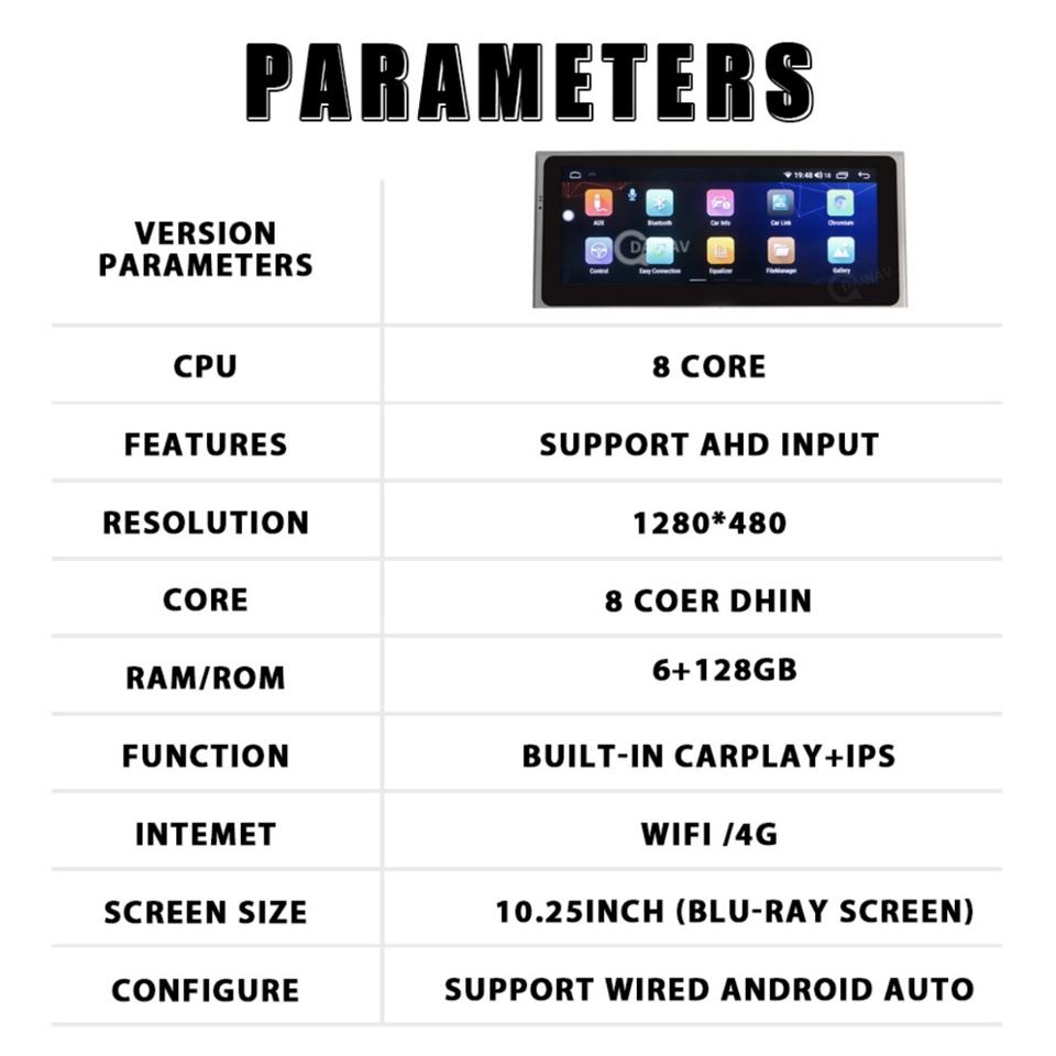 CarPlay, Android auto, Compatible con Bluetooth, Construir-En DSP, MP3/MP4, Pantalla táctil, Visor de imágenes, Sintonizador Radio, Control remoto, Cámara de copia de seguridad, Guía de voz, Control del Volante, Pantalla dividida, Carretera de planificación, Invertir la ayuda, En directo/Live el tráfico, MultiMedia apoya, De modo Dual, sistema de navegación, Velocidad de alerta, Construir-en el micrófono, Descarga la aplicación desde Play Store