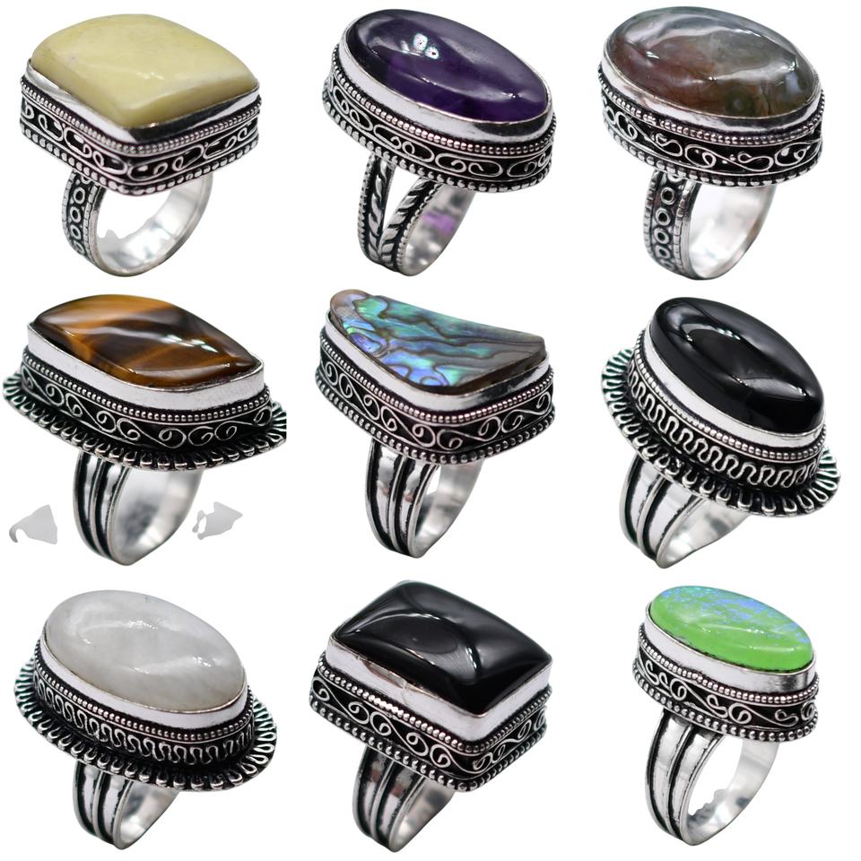 Lote de 10 Anillos Hechos a Mano con Baño de Plata y Piedras Preciosas Originales para Chicas y Mujeres, con Engaste de Bisel, para Bodas y Fiestas