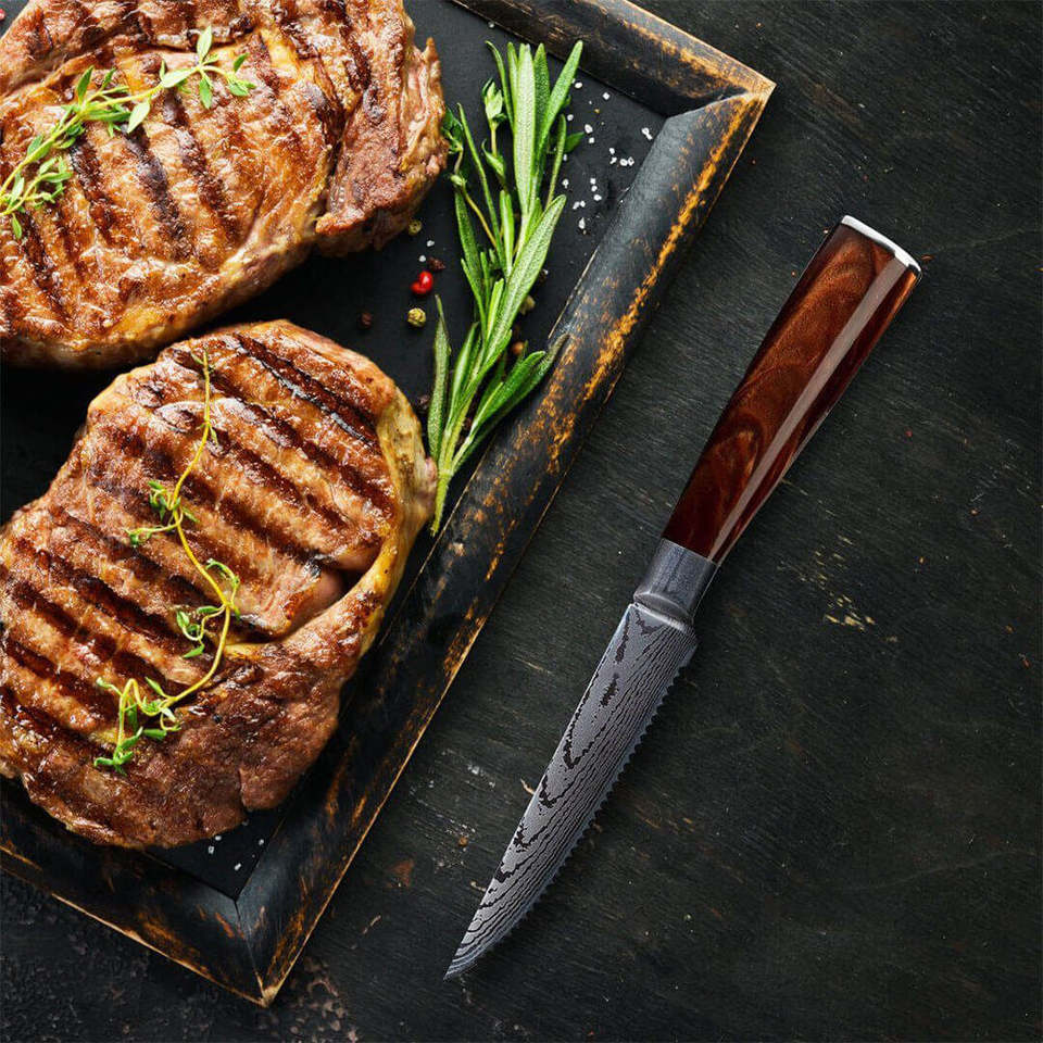 Juego de 10 Cuchillos de Cocina de Acero Inoxidable con Patrón Láser de Damasco y Mango de Resina Marrón, Venta al por Mayor de Fábrica