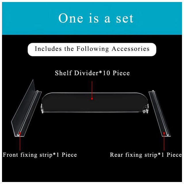 Uno es un conjunto:Cada conjunto contiene (10 unids estante divisor + 1 unids frontal y tira de fijación trasera)