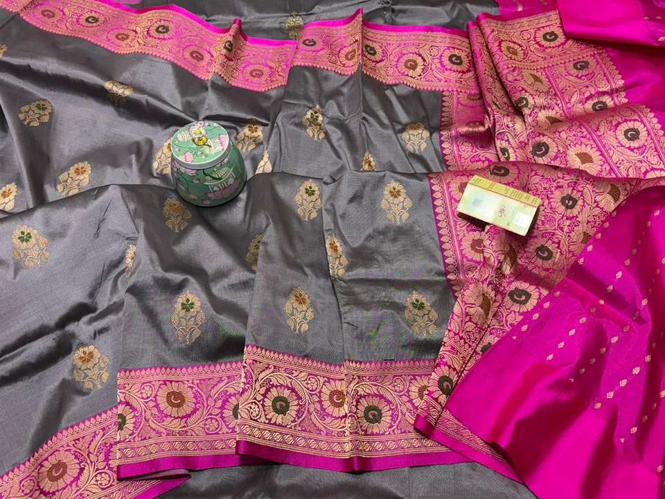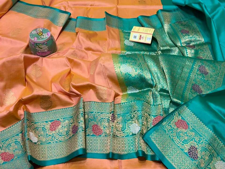Sari Banarasi Katan 100% Auténtico, Tejido a Mano con Seda Pura, con Ricos Bordados Zari y Pallu en Contraste