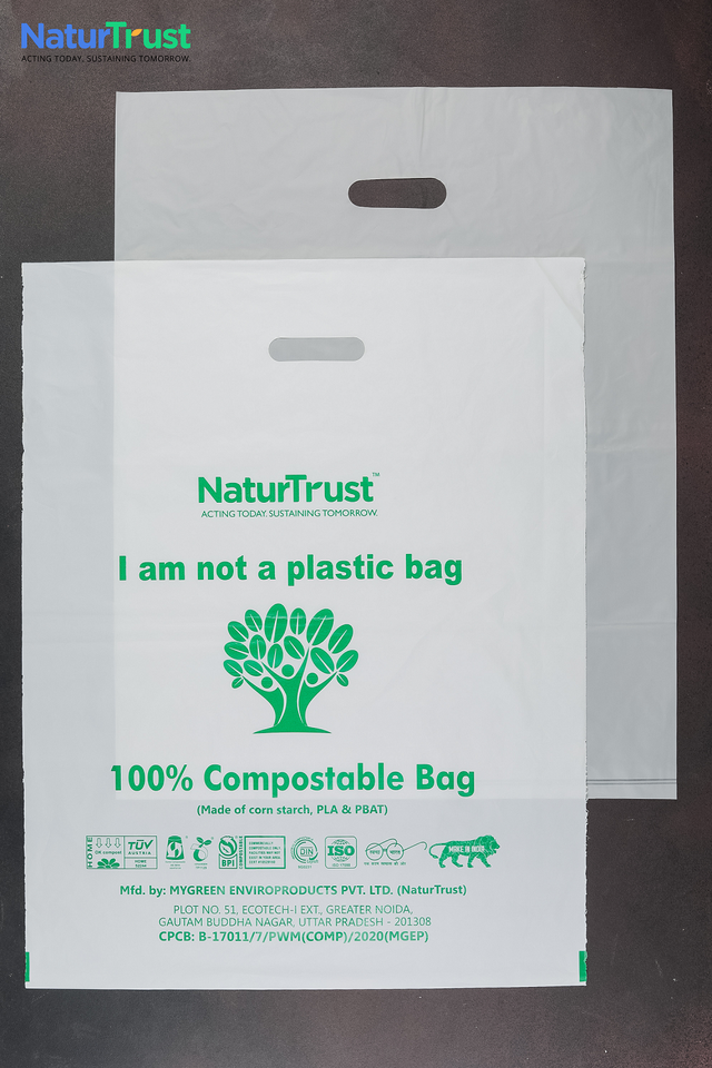 Bolsas de transporte de almidón de maíz biodegradable 100%, Asa de bucle suave impresa personalizada, embalaje ecológico y reutilizable