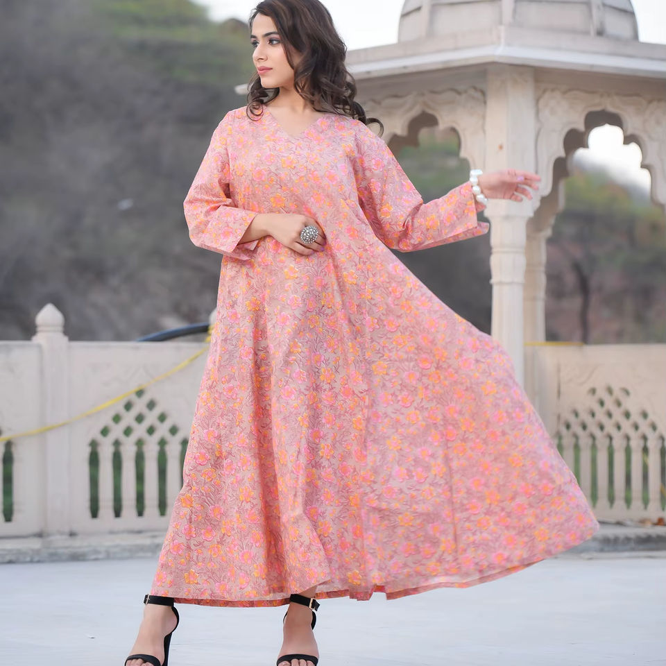 100% algodón bloque de mano impreso verano brisa Floral vestido ecológico Rosa Casual vestido largo hecho a mano