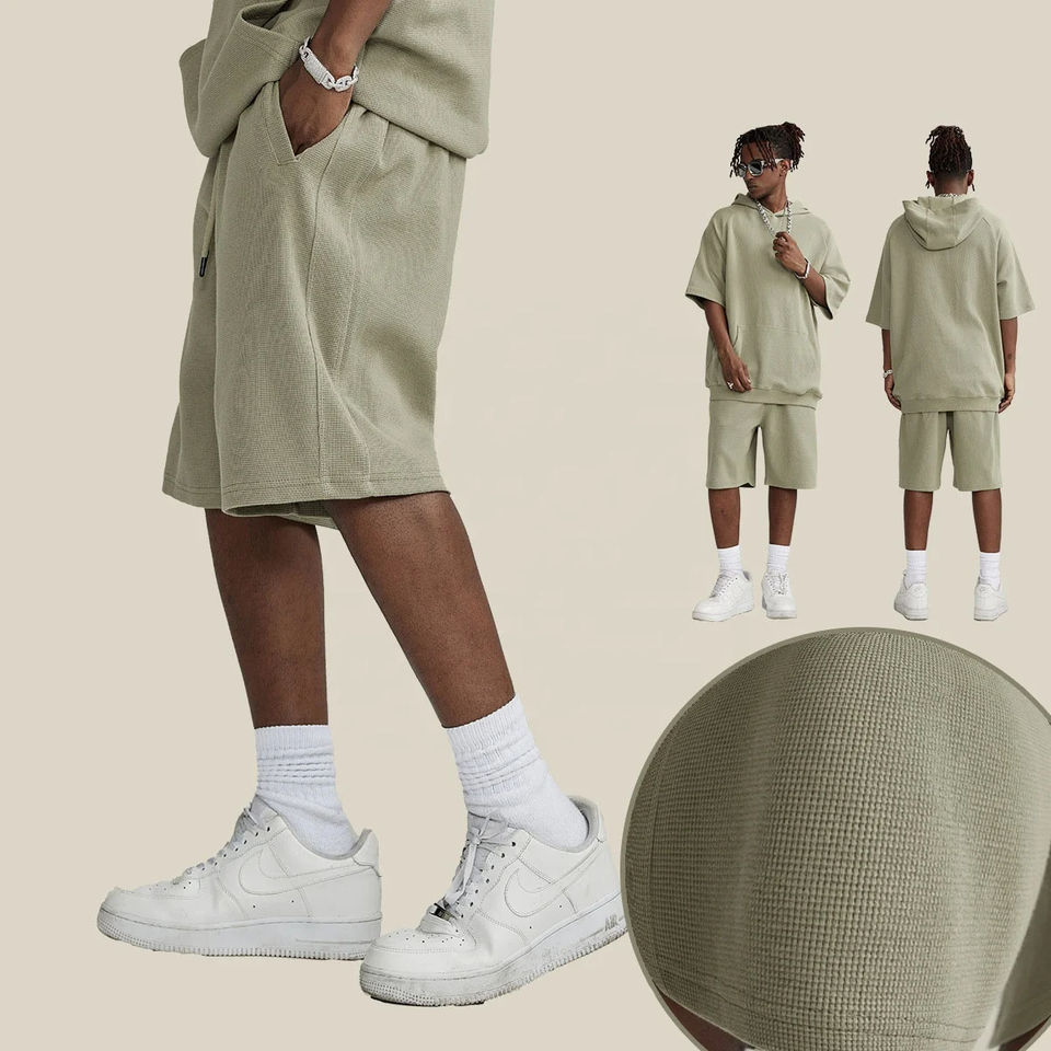 Pantalones cortos de sudor para hombre de rizo de algodón 100% patrón DTG personalizado dobladillo de borde crudo lavado ácido desteñido al sol ecológico