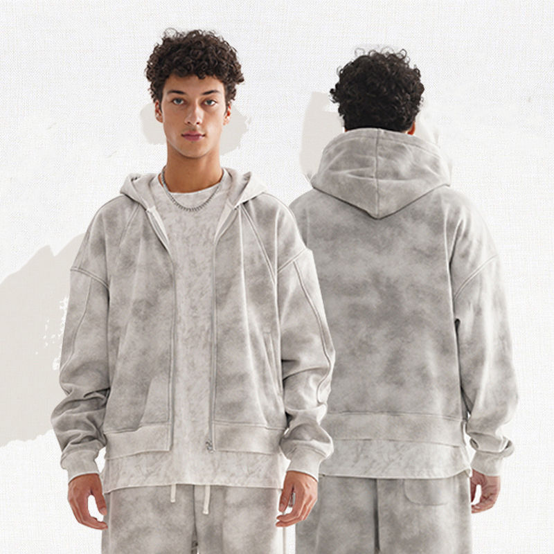 100% algodón Unisex en blanco francés Terry Sudadera con capucha de gran tamaño chaqueta con cremallera hombres contraste costura Zip up Sudadera con capucha