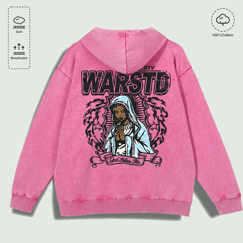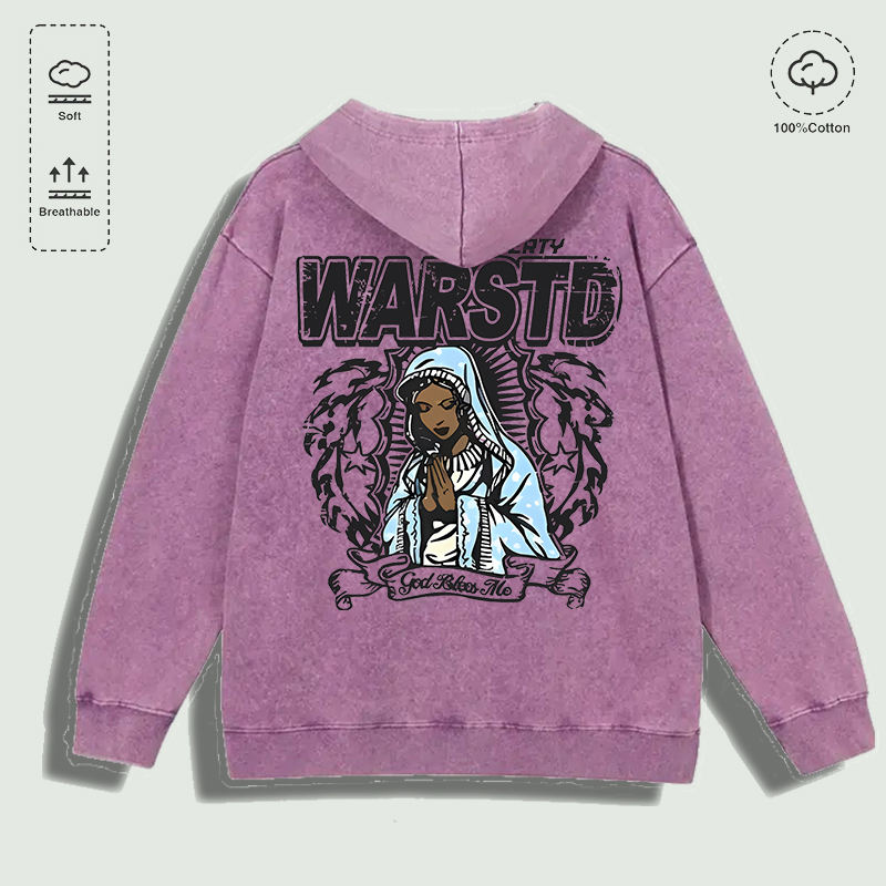 Sudadera con Capucha 100% Algodón Lavado con Estampado Gráfico de Figura Orando, Varios Colores
