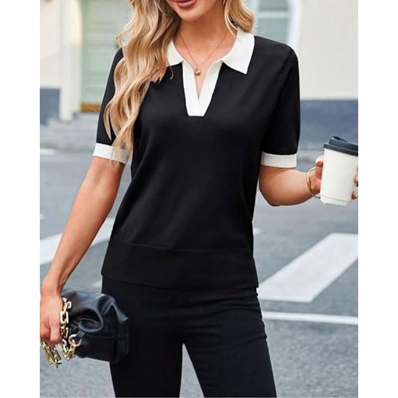 Suéter Polo de Manga Corta para Mujer 100% Algodón | Top de punto acanalado con cuello en V | Camiseta Polo Holgada Informal