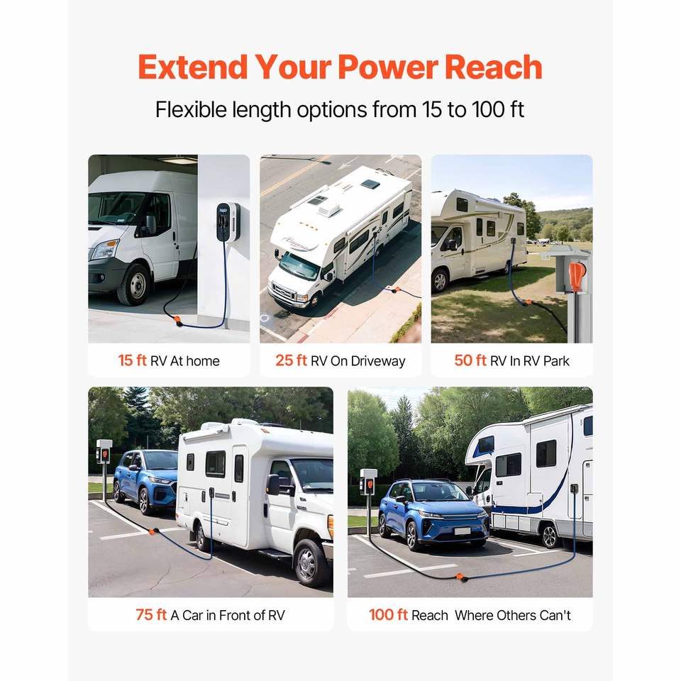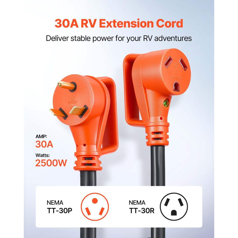 Cable de Extensión para RV de Alta Resistencia de 30.5 m (100 pies), 30 Amperios, 125V, 2500W, Cable STW Calibre 10/3 con Enchufe Macho NEMA TT-30P y Enchufe Hembra NEMA TT-30R con LED