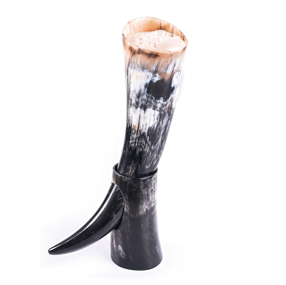 Cuerno para beber de cerveza vikinga con logotipo personalizado Natural 100%, decoración de cuerno de búfalo pulido a mano, soporte de hierro, té de estilo Animal único