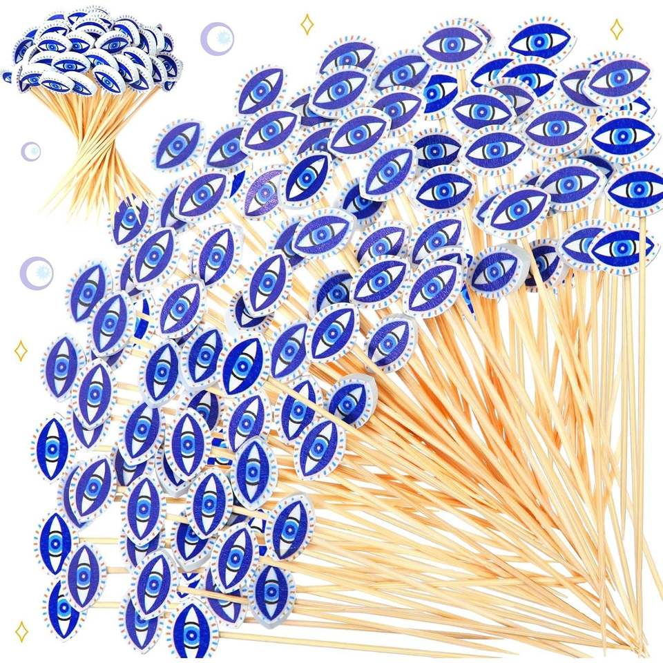 100 Palillos de Bambú Decorativos de 4.7 Pulgadas con Diseño de Ojo Turco Azul para Aperitivos y Brochetas