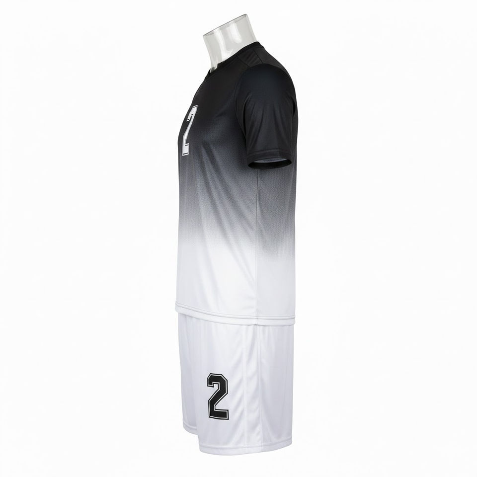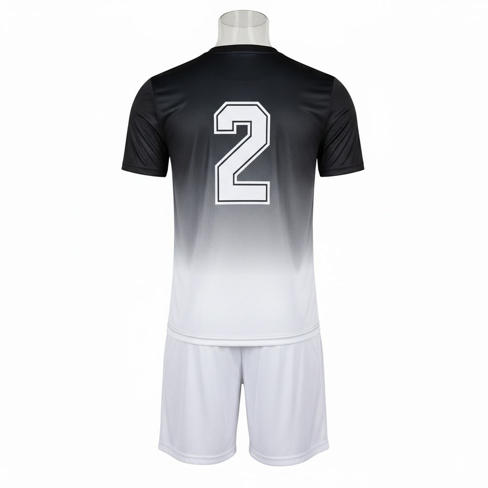 Uniforme de Fútbol Sublimado Personalizado 100% Poliéster, Transpirable, de Secado Rápido, Conjunto de Equipación Deportiva con Degradado Blanco y Negro