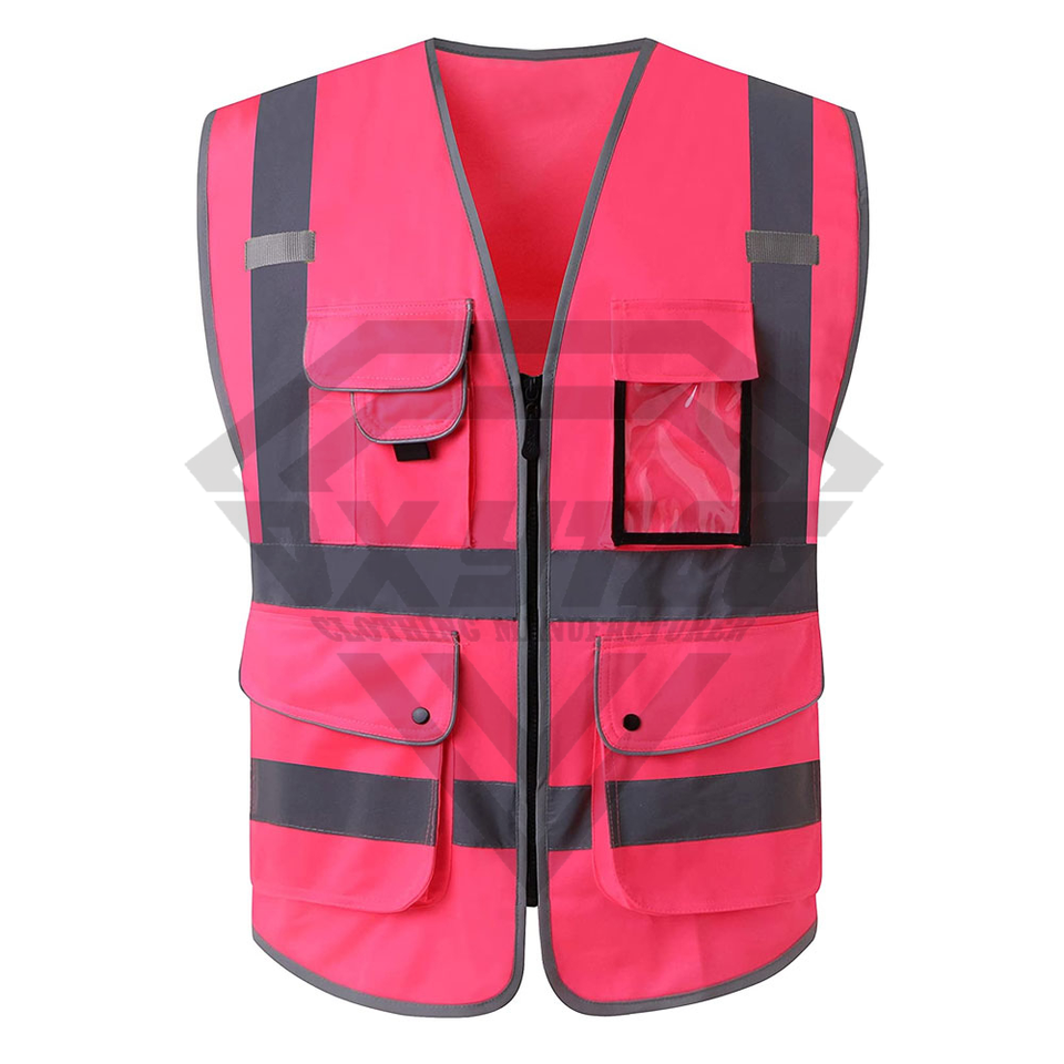 Chaleco de seguridad de poliéster 100%, logotipo personalizado, cremallera frontal reflectante de alta visibilidad, nailon de algodón ignífugo a prueba de agua