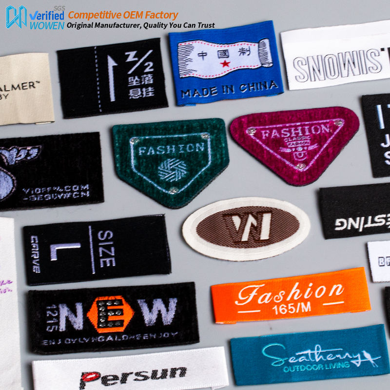 Etiquetas tejidas de poliéster 100% para tops para etiquetas de tamaño de ropa de Amazon con borde cortado con láser para coser