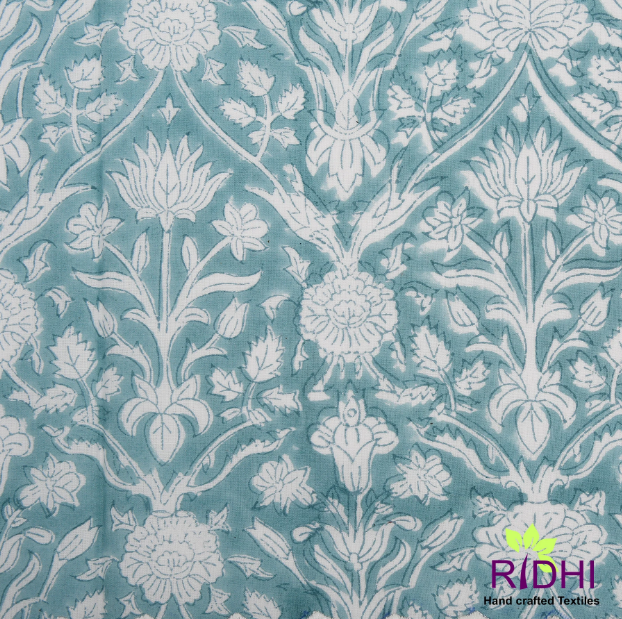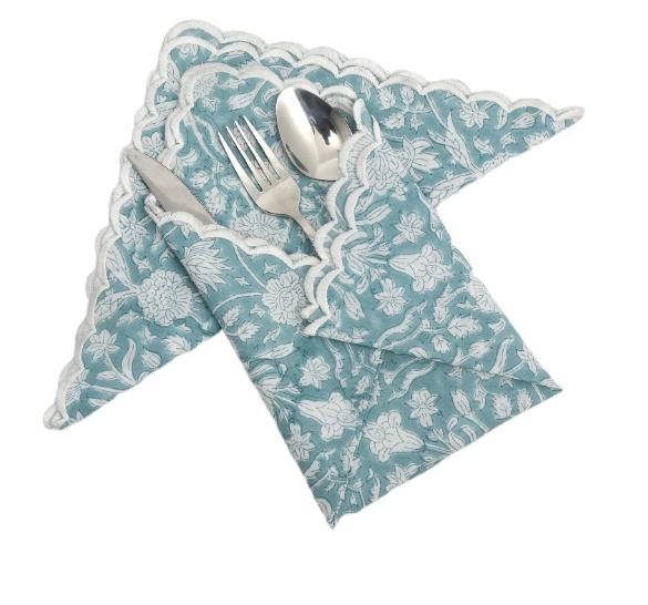 Servilletas de tela de algodón puro 100%, servilletas bordadas indias estampadas hermosas florales de bloque de mano azul y blanco cadete claro