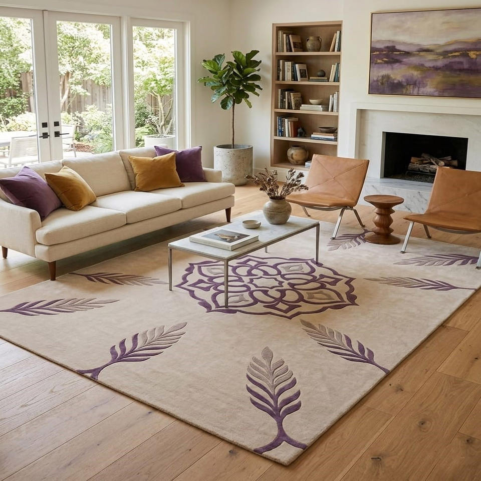 Alfombra 100% Lana de Nueva Zelanda, Hecha a Mano por Expertos con Patrones Geométricos en Relieve Color Morado, Tacto Suave