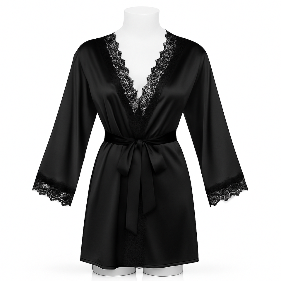 Bata de satén 100% seda con mangas de encaje y cuello con cordón, patrón sólido, suave, para dormir en primavera, para mujer