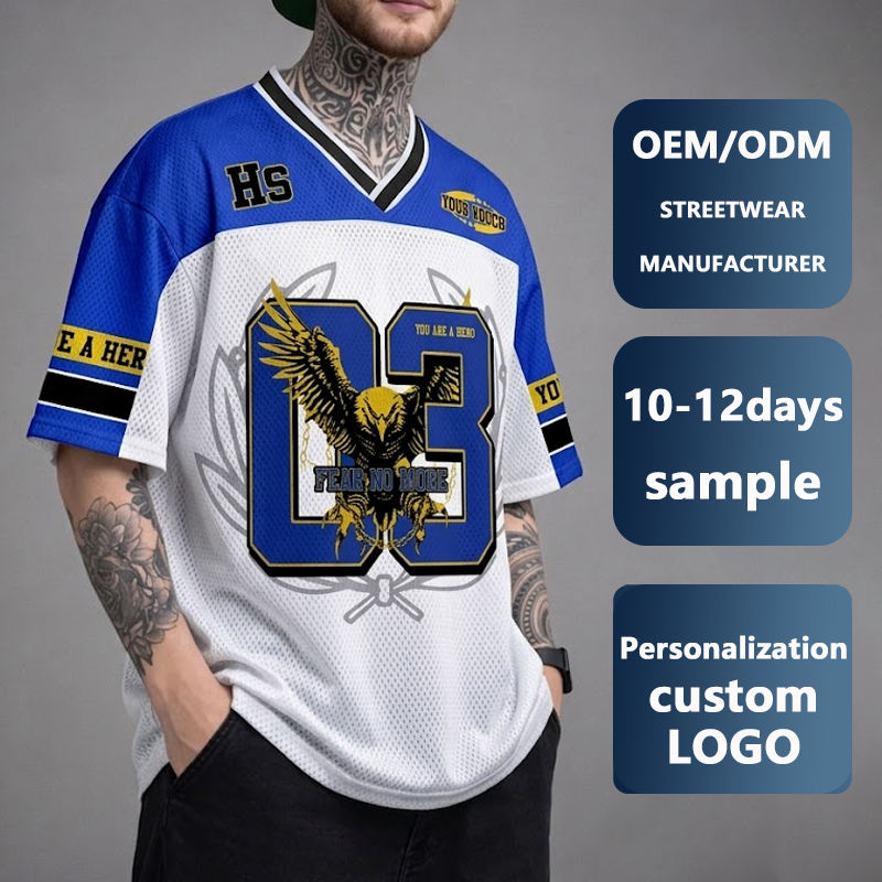 Camiseta de fútbol de malla holgada estilo streetwear para hombre, cuello en V, hip hop, oversize, hombros caídos, con bordado gráfico de águila