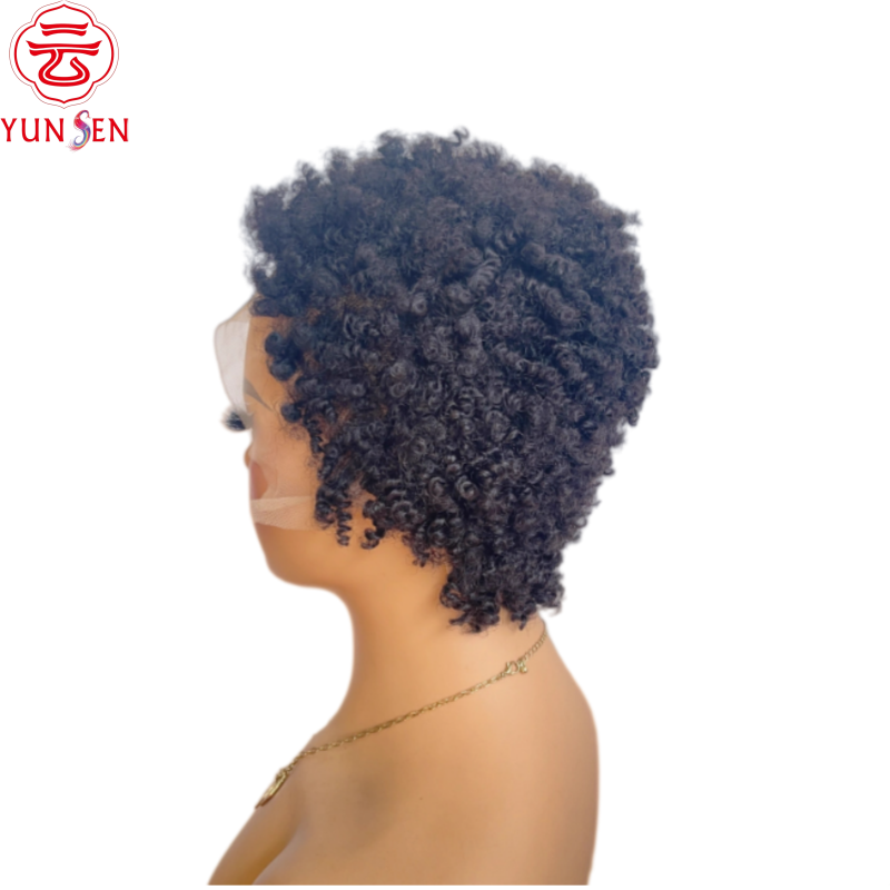 Peluca de Cabello Remy Chino 100% Virgen, con Frente de Encaje 13x4, Base Transparente sin Pegamento, Corta y Rizada para Mujeres