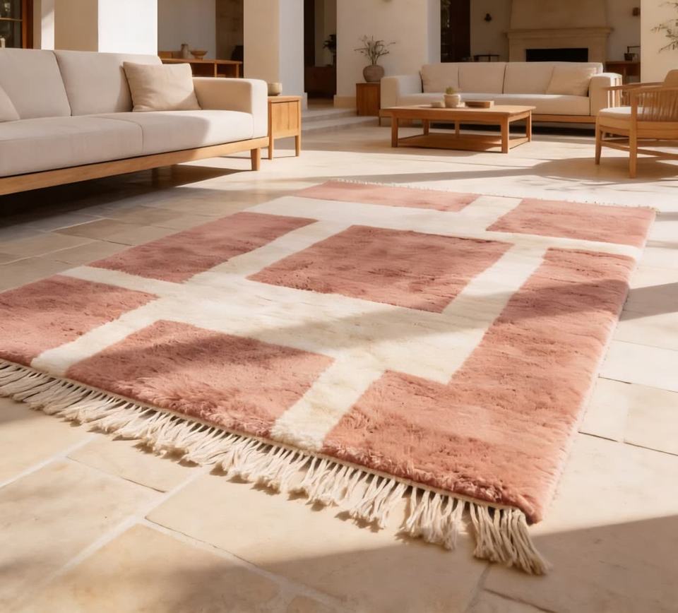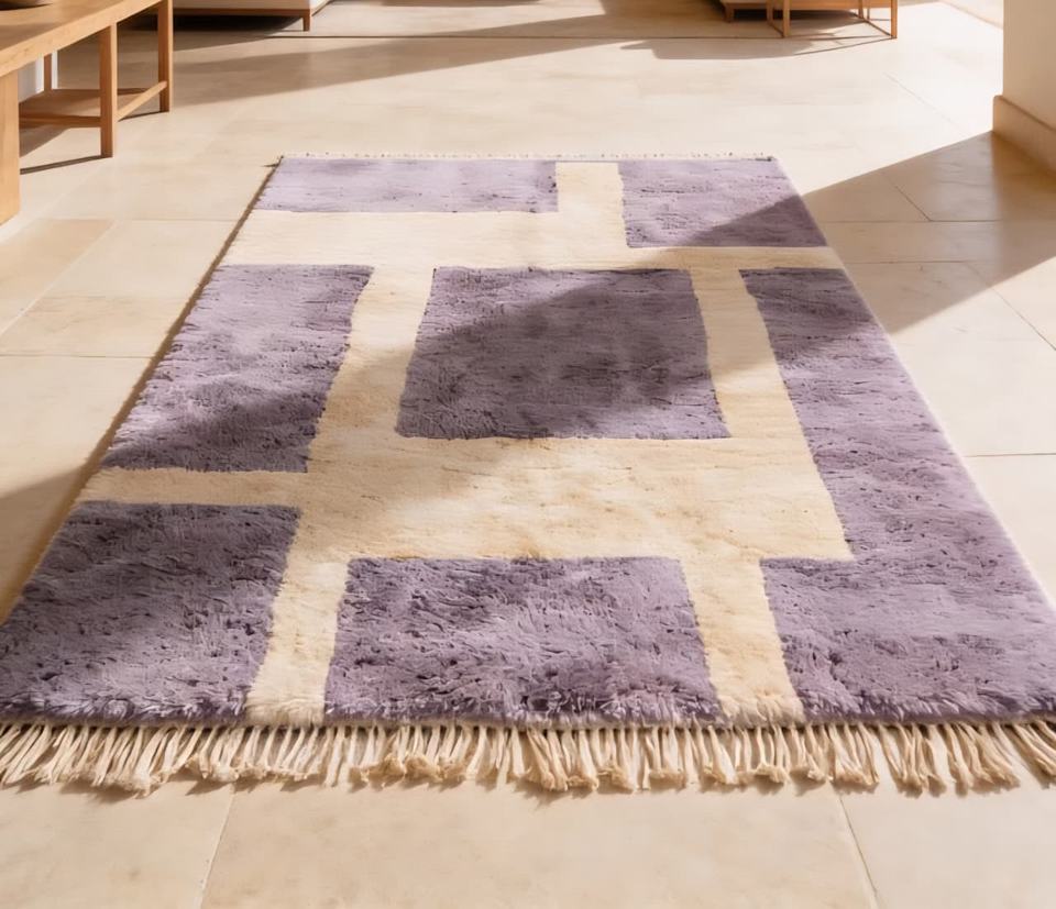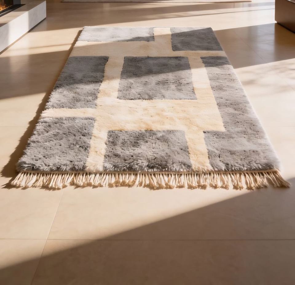 Alfombra Beni Ourain 100% Lana, Hecha a Mano en Marruecos, Estilo Berber, Anudada a Mano, Geométrica, Peluda, Venta al Por Mayor